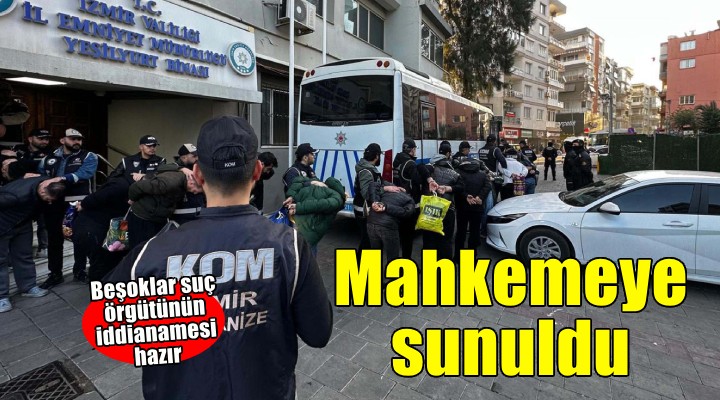 ?zmir'de 'Be?oklar' olarak bilinen suç örgütüne yönelik 34'ü tutuklu 46 ?üpheli hakk?nda haz?rlanan iddianame tamamland?. Mahkemeye sunulan 469 sayfal?k iddianamede 19 ?üpheli için a??rla?t?r?lm?? müebbet hapis cezas?, di?er ?üpheliler için ise 14 y?ldan 20 y?la kadar hapis cezas? istendi