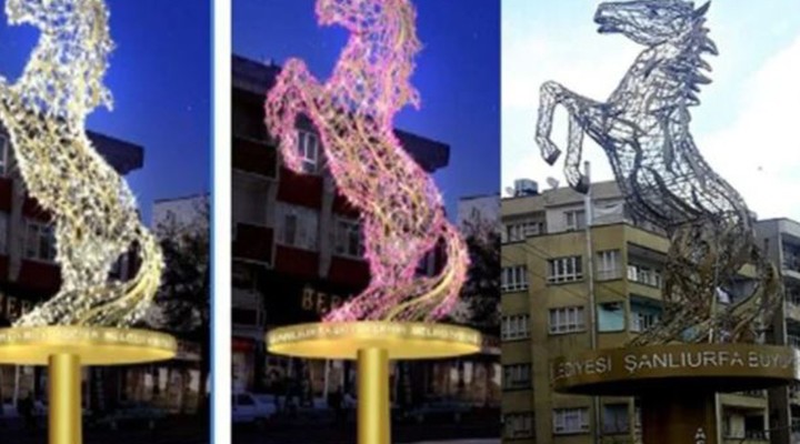 ?anl?urfa Büyük?ehir Belediyesi bir süre önce ayd?nlatma direklerinde kullan?lmak üzere dekoratif ayd?nlatma asma-germe ve direk motifi ihalesi açt?. KDV dahil 6 milyon 40 bin TL bedelle gerçekle?en ihaleyi kazanan firma, ihale ?artnamesinde bulundu?u için ?ehitlik Kav?a??'na at heykeli yap?ld?.