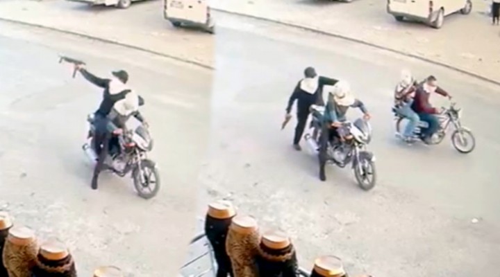 Yüzlerini maskelerle gizleyen ?üpheliler, sald?r?n?n ard?ndan havaya ate? açarak bölgeye geldikleri motosikletlerle kaçt?. Bu anlar i? yerinin güvenlik, bir ki?inin de cep telefonu kameras?na anbean yans?d?.
