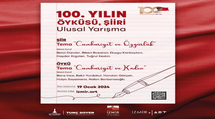 ?zmir Büyük?ehir Belediyesi’nin Cumhuriyet’in 100’üncü y?l dönümü kapsam?nda düzenledi?i “100. Y?l?n Öyküsü, ?iiri” adl? ulusal öykü ve ?iir yar??mas?na ba?vurular devam ediyor. Son kat?l?m tarihi 19 Ocak 2024 olan yar??ma ?iir kategorisinde “Cumhuriyet ve Özgürlük”, öykü kategorisinde ise “Cumhuriyet ve Kad?n” temalar?yla düzenleniyor. Cumhuriyet’in kurucu ku?a??n?n ça?da? ve ayd?nl?k miras?n? ana oda??na alan ulusal kat?l?ml? yar??ma, yüz y?ll?k tarihi birikimin toplumsal ve kültürel izdü?ümüne mercek tutmay? hedefliyor.