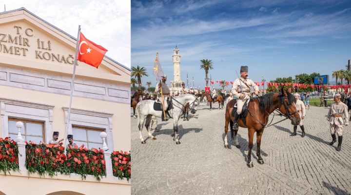 Konak Atatürk Meydan?’na gelen süvari birlikleri, kentin kurtulu?unu simgeleyen tarihi sahneyi bir kez daha canland?rarak, ?zmirlilerin alk??lar? aras?nda Türk Bayra??’n? Hükümet Kona??’n?n gönderine çekti. ?zmir Büyük?ehir Belediye Ba?kan? Tunç Soyer ise törenin ard?ndan Yüzba?? ?erafettin’i temsil eden Süvari Birlikleri Komutan?’na te?ekkür plaketi sundu.