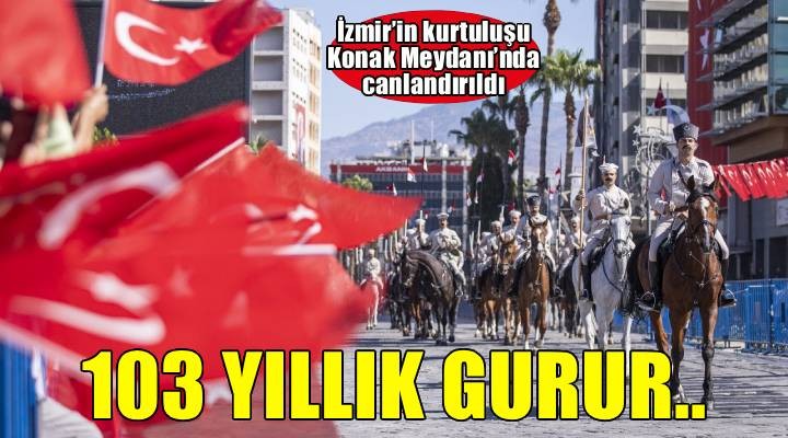Konak Atatürk Meydan?’na gelen süvari birlikleri, kentin kurtulu?unu simgeleyen tarihi sahneyi bir kez daha canland?rd?. ?zmirlilerin alk??lar? aras?nda bir asker Türk Bayra??’n? Hükümet Kona??’n?n gönderine çekti. ?zmir Büyük?ehir Belediye Ba?kan? Dr. Cemil Tugay Yüzba?? ?erafettin’i temsil eden Süvari Birlikleri Komutan?’na te?ekkür plaketi sundu.