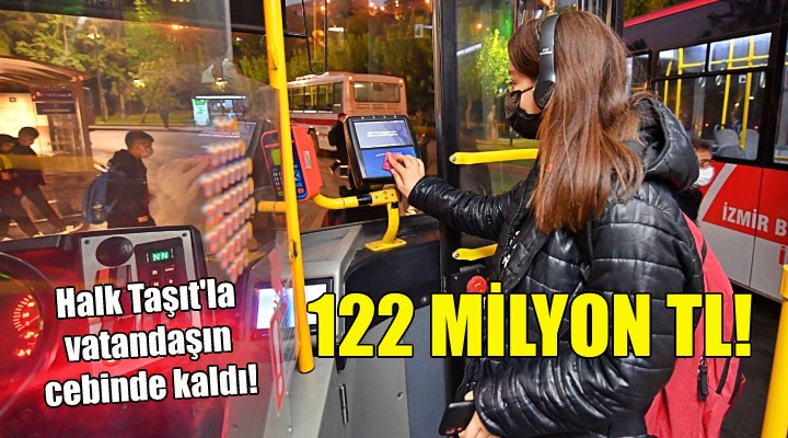 ?zmir Büyük?ehir Belediyesi’nin 29 Nisan 2019’da ba?latt??? Halk Ta??t uygulamas?, vatanda?lar?n toplu ula??m bütçesine önemli katk? sa?lad?. Her gün 05.00-07.00 ve 19.00-20.00 saatleri aras?nda geçerli olan ve tüm tarifelerde yüzde 50 indirim sa?layan uygulama sayesinde bugüne dek ?zmirlilerin cebinde kalmas? sa?lanan toplam tutar yakla??k 122 milyon TL oldu.