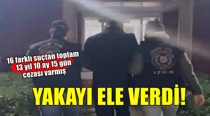 Asayi? ?ube Müdürlü?ü Güven Timleri Büro Amirli?i ekipleri, aranan ?üphelilere yönelik dün Gaziemir ilçesinde çal??ma yapt?. Yap?lan kontrolde durdurulan bir ?üphelinin 'silahl? tehdit' ve 'ya?ma' gibi 16 farkl? suçtan toplam 13 y?l 10 ay 15 gün kesinle?mi? hapis cezas? oldu?u ortaya ç?kt?. ?üphelinin yakalanmamak için ba?kas?na ait kimlik bilgilerini kulland??? ö?renildi. Emniyetteki i?lemlerinin ard?ndan adliyeye sevk edilen V.K. tutukland?.