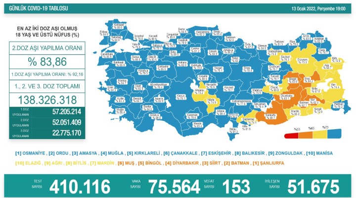 Sa?l?k Bakanl???'n?n payla?t??? haritada, 2. doz a??lamada hedef nüfusun yüzde 75 ve üzerinin a??land??? iller mavi renkle gösteriliyor. Sa?l?k Bakanl???'n?n koronavirüs verilerine ili?kin yay?nlad??? tabloda yer alan bilgilere göre; 2. doz a??lamada yüzde 88.3 a??lama oran?yla Osmaniye birinci s?rada yer al?yor. Yüzde 60.7 a??lama oran? ile ?anl?urfa ise son s?rada bulunuyor. 2. doz a??lamada üç büyük ilde ise birinci s?rada yüzde 84.3 ile ?zmir, ikinci s?rada yüzde 82 ile Ankara ve üçüncü s?rada yüzde 76.8 ile ?stanbul yer al?yor.