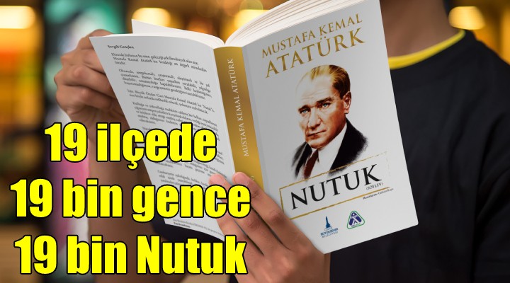 ?zmir Büyük?ehir Belediyesi, 19 May?s Atatürk’ü Anma, Gençlik ve Spor Bayram?’nda gençlere Mustafa Kemal Atatürk’ün Nutuk’unu hediye etti. ?ZELMAN A.?. Genel Müdürlü?ü’nün bast?rd??? 19 bin Nutuk, Büyük?ehir Belediyesi Yerel Hizmet Birimleri taraf?ndan 19 May?s hat?ras? olarak ?zmir’in merkez d???ndaki 19 ilçesinde 19 bin gence da??t?ld?.