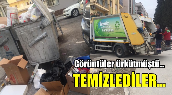 SONKALE?ZM?R'in gündeme getirdi?i bu çirkin manzarayla ilgili Kar??yaka Belediyesi ekipleri, gecikmeli de olsa harekete geçti. Bugün saat 10.00 s?ralar?nda ?mbatl? Mahallesi 6086 Sokak'a gelen temizlik i?leri çal??anlar?, konteynerlerde birikmi? çöpleri al?p etrafa saç?lanlar? toplad?. Mahalle sakinleri ise ?imdilik rahat bir nefes ald?.