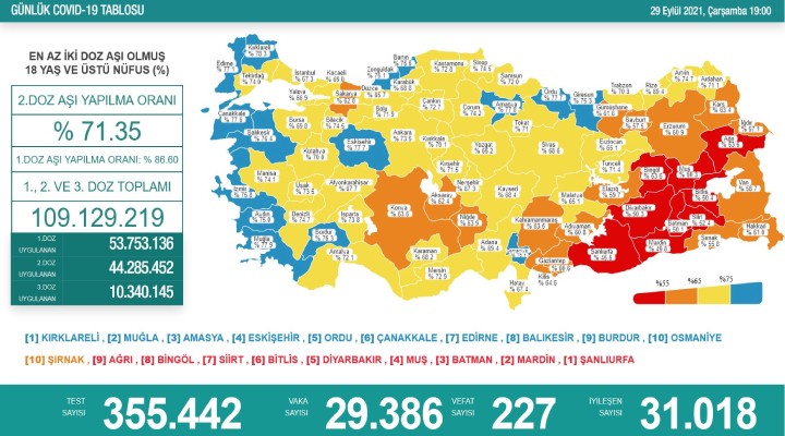 Sa?l?k Bakanl???'n?n payla?t??? haritada, 2. doz a??lamada hedef nüfusun yüzde 75 ve üzerinin a??land??? iller mavi renkle gösteriliyor. Sa?l?k Bakanl???'n?n koronavirüs verilerine ili?kin yay?nlad??? tabloda yer alan bilgilere göre; 2. doz a??lamada yüzde 78,3 a??lama oran?yla K?rklareli birinci s?rada yer al?yor. ‘Mavi iller’ listesinde K?rklareli'ni s?ras?yla Mu?la, Amasya, Eski?ehir, Ordu, Çanakkale, Edirne, Bal?kesir, Burdur, Osmaniye izliyor. Yüzde 45,5 a??lama oran? ile ?anl?urfa ise son s?rada bulunuyor.