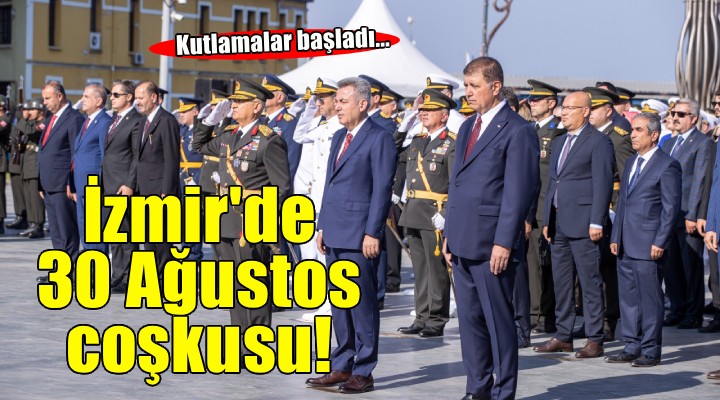 30 A?ustos Zafer Bayram? kutlamalar? Cumhuriyet Meydan?'ndaki resmi törenle ba?lad?. Törene ?zmir Büyük?ehir Belediye Ba?kan? Dr. Cemil Tugay, Ege Ordusu ve Garnizon Komutan? Orgeneral ?rfan Özsert, ?zmir Valisi Dr. Süleyman Elban, CHP Genel Ba?kan Yard?mc?s? ve Parti Sözcüsü ?zmir Milletvekili Deniz Yücel, CHP ?zmir Milletvekili Ednan Arslan, MHP ?zmir Milletvekili Tamer Osmana?ao?lu, ?Y? Parti ?zmir Milletvekili Hüsmen K?rkp?nar ile sivil toplum örgütlerinin temsilcileri, üniversite rektörleri kat?ld?. Tören, Cumhuriyet Meydan?’nda bulunan Atatürk An?t?'na çelenk sunulmas? ve sayg? duru?undan sonra ?stiklal Mar??'n?n okunmas?yla devam etti.