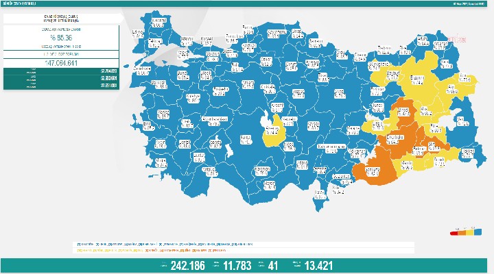 Sa?l?k Bakanl???'n?n payla?t??? haritada, 2. doz a??lamada hedef nüfusun yüzde 75 ve üzerinin a??land??? iller mavi renkle gösteriliyor. Sa?l?k Bakanl???'n?n koronavirüs verilerine ili?kin yay?nlad??? tabloda yer alan bilgilere göre; 2. doz a??lamada yüzde 89.4 a??lama oran?yla Osmaniye birinci s?rada yer al?yor. Yüzde 62.6 a??lama oran? ile ?anl?urfa ise son s?rada bulunuyor. 2. doz a??lamada üç büyük ilde ise birinci s?rada yüzde 85.2 ile ?zmir, ikinci s?rada yüzde 82.8 ile Ankara ve üçüncü s?rada yüzde 77.6 ile ?stanbul yer al?yor
