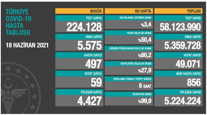 Sa?l?k Bakanl???'nca duyurulan 'Türkiye Covid- 9 Hasta Tablosu'na göre; son 24 saatte yap?lan 224 bin 128 testte 5 bin 575 vaka, 497 hasta tespit edildi. Virüs nedeniyle 59 ki?i hayat?n? kaybederken, 4 bin 427 ki?inin de tedavisi ve karantinas? sona erdi. Bugünkü verilerle toplam test say?s? 58 milyon 123 bin 990, toplam vaka say?s? 5 milyon 359 bin 728, toplam vefat say?s? 49 bin 71, toplam a??r hasta say?s? 856, toplam iyile?en say?s? ise 5 milyon 224 bin 224 oldu.