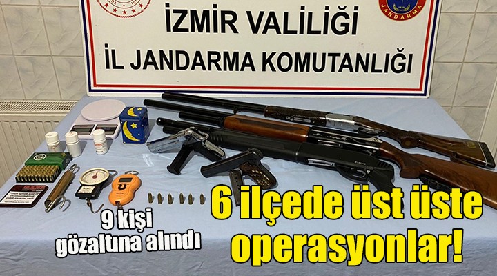 Ekipler, Tire ilçesinde uyu?turucu ticareti yapt??? belirlenen H.G, G.Ç, M.U. ve E.D'nin adreslerine düzenledi?i operasyonda ise 16 gram metamfetamin ele geçirdi. Gözalt?na al?nan ?üpheliler sorgulanmak üzere jandarmaya götürüldü. Bay?nd?r ilçesinde ise ormanl?k alanda yap?lan aramada 187 kök hint keneviri ele geçirildi, F.D, U.U, ?.S. ve H.A. gözalt?na al?nd?. ?üphelilerin adreslerinde bir miktar metamfetamin ile sentetik uyu?turucuyu içmeye yarayan aparat ve 1 kuru s?k? tabanca bulundu. Kiraz, Tire ve Beyda? ilçelerindeki ormanl?k arazilerde de 3 bin 574 kök hint keneviri ele geçirildi.