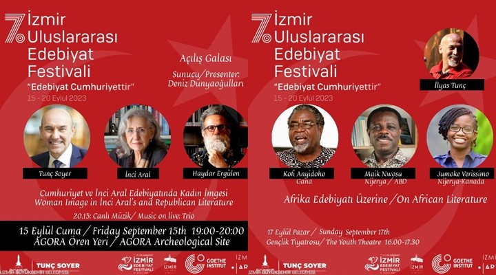 Bu y?l 7.’si düzenlenecek Uluslararas? ?zmir Edebiyat Festivali 15 – 20 Eylül tarihleri aras?nda edebiyat dünyas?n?n önemli isimlerini ?zmir'de bulu?turacak. Festival, Cumhuriyet’in 100. kurulu? y?l dönümü nedeniyle “Edebiyat Cumhuriyettir” temas?yla 15 Eylül’de saat 19.00’da Agora Arkeolojik Kaz? Alan?'ndaki aç?l?? töreni ile ba?layacak. Direktörlü?ünü Haydar Ergülen’in yapt??? festivalin onur konu?u sanatç?s? ?nci Aral olacak. Ülkenin ve dünyan?n dört bir kö?esinden pek çok ünlü yazar ve edebiyatç?ya ev sahipli?i yapacak festivalde kentin farkl? bölgelerinde panel, söyle?i, ?iir dinletileri yap?lacak ve tiyatro oyunlar? sahnelenecek.