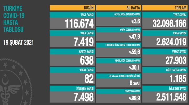 Sa?l?k Bakanl???'nca duyurulan 'Türkiye Covid- 19 Hasta Tablosu'na göre; son 24 saatte yap?lan 116 bin 674 testte 7 bin 419 vaka, 638 hasta tespit edildi. Virüs nedeniyle 82 ki?i hayat?n? kaybederken, 7 bin 498 ki?i de iyile?ti. Bugünkü verilerle toplam test say?s? 32 milyon 98 bin 166, toplam vaka say?s? 2 milyon 624 bin 19, toplam vefat say?s? 27 bin 903, toplam a??r hasta say?s? 1185, toplam iyile?en hasta say?s? 2 milyon 511 bin 548 oldu.