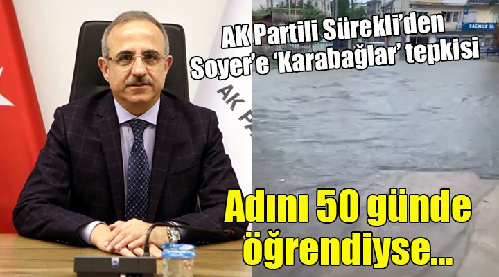 SONKALE?ZM?R-?zmir'de bugün etkili olan sa?anak ya??? özellikle Karaba?lar'da yurtta?lara zor anlar ya?at?rken, AK Parti ?zmir ?l Ba?kan? Kerem Ali Sürekli'den tepki geldi. ?zmir Büyük?ehir Belediye Ba?kan? Tunç Soyer'in 23 Nisan'da Karaba?lar'dan üstü acç?k otobüsle geçerken etraf?ndakilere 'Neresi bura' sorusuna at?fta bulunan Sürekli, sosyal medya hesab?ndan bir video payla?arak tepki gösterdi.