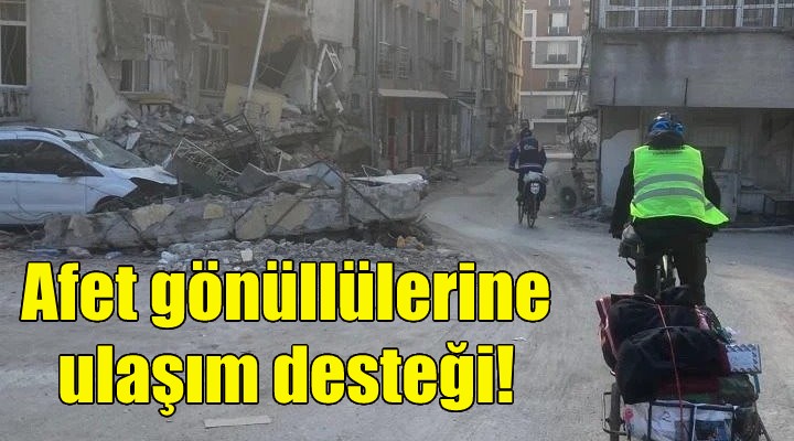 Deprem bölgelerine destek için tüm birimlerini seferber eden ?zmir Büyük?ehir Belediyesi, sivil toplum kurulu?lar?ndan bölgeye ula?mak isteyenlere de lojistik destek sa?lad?. Aralar?nda arama kurtarma ekiplerinin de oldu?u 274 gönüllüyü depremin büyük y?k?ma yol açt??? Hatay, Ad?yaman, Kahramanmara?, Gaziantep, Osmaniye ve Adana’ya ula?t?rmak için 11 otobüs tahsis edildi. ?zmirli gönüllü bisikletlilerden olu?an BisiDestek’e lojistik destek sa?layan ?zmir Büyük?ehir Belediyesi, gönüllüleri bölgeye ta??d?. Bisikletli gönüllüler depremzedelere s?cak yemek ula?t?r?lmas?ndan ilaç da??t?m?na, çad?r kurulmas?ndan farkl? ihtiyaçlara kadar h?zla organize olarak etkin rol oynad?.