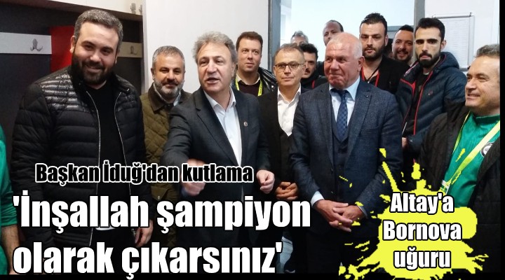 SONKALE?ZM?R-Bornova Belediye Ba?kan? Mustafa ?du?, TFF 1. Lig'de lider Hatayspor'u 2-1 yenerek direkt Süper Lig'e yükselme yolunda umutlanan Altay'?n sevincine ortak oldu. Maç?n biti? düdü?ünün ard?ndan kulüp ba?kan? Özgür Ekmekçio?lu ve Kemalpa?a Belediye Ba?kan? R?dvan Karakayal? ile birlikte soyunma odas?na inen Ba?kan ?du? futbolculara, "Altay, 6 haftad?r Bornova'da hiç kaybetmeden maç kazan?yor. Bu sizin ba?ar?n?z. Bornova Belediye Ba?kan? olarak çok mutluyum. ?n?allah buradan ?ampiyon olarak ç?kacaks?n?z" diye konu?tu. Konu?man?n ard?ndan siyah-beyazl? oyuncular, Ba?kan ?du?'la birlikte "Büyük Altay" tezahürat? yaparak galibiyeti kutlad?.