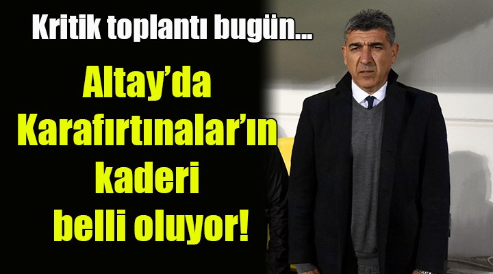 Abdullah ÇELEB?/SONKALE?ZM?R-TFF 1. Lig'de üst üste 4 yenilgi ald?ktan sonra iç sahada son s?radaki Eski?ehirspor'la 1-1 berabere kalarak taraftar?n? kahreden Altay'da ele?tirilerin oda??ndaki teknik direktör Sait Karaf?rt?nalar'?n kaderi bugün belli oluyor. Eski?ehir s?nav?n?n ard?ndan Menemen ?lçe Stad?'nda yakla??k bir saat durum de?erlendirmesi yapan Ba?kan Özgür Ekmekçio?lu ile Sportif Direktör Özden Törayd?n'?n bugün tekrar bir araya gelerek kötü gidi?at? masaya yat?raca?? ö?renildi. Üst üste gelen kötü sonuçlar nedeniyle camiada olu?an olumsuz havay? de?i?tirmek isteyen Ekmekçio?lu ve Törayd?n'?n radikal karalar alabilece?i ö?renildi.