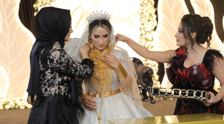 Yöresel yemek ikram? yap?lan dü?ünde, özel kutu ve tepsilerde getirilen 6 kilo a??rl???nda bilezik, taç, kemer, gerdanl?k ve kolye gibi tak?lar geline tak?ld?. Alt?nlar?n a??rl??? nedeniyle hareket edemeyen geline yak?nlar? yard?mc? olurken, alt?n takmayan davetliler ise salondaki sand??a para ve alt?n koyarak isimlerini yazd?klar? zarflar? att?. Gece sonunda aç?lan sand?ktaki zarflar, iki valize dolduruldu.