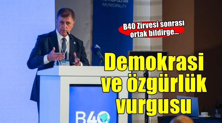 Ba?kan Tugay, “Demokrasi ve özgürlükler olmadan insanlar?n mutlu olmayaca??n?, refah içinde ya?ayamayaca??n? ve iklim krizi gibi sorunlar?n da düzelmeyece?ini biliyoruz. Sorunlar?n çözümü için dost ellerle el s?k??may?, ortak çal??may?, beraber mücadele etmeyi ö?renmeliyiz ” dedi. Zirvenin sonunda B40 ?zmir Kültür ve Ekonomi Ortak Bildirgesi yay?mland?.