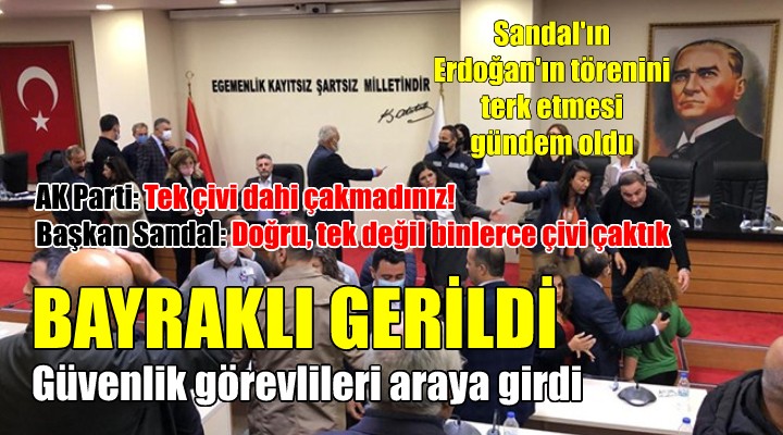 Ba?kan Serdar Sandal ise Türkiye Cumhuriyeti devletinin bir siyasi partinin babas?n?n mal? olmad???n? söyledi. Yat?r?mlar?n yurtta?lar?n ödedi?i vergilerle yap?ld???n?, hiçbir siyasi partiye mal edilemeyece?ini vurgulayan Sandal, benzer durumdaki birçok kentte yap?l?rken ?zmir'in neden afet bölgesi ilan edilmedi?ini sordu. Ba?kan Sandal, toplant?y? terk etmesinin nedeninin ise Erdo?an'?n CHP lideri Kemal K?l?çdaro?lu'na yönelik sözleri oldu?unu an?msatt?. Sandal, "Ben CHP’li bir belediye ba?kan?y?m. Benim siyasi bir kimli?im var. Ben Bayrakl? Belediye ba?kan? olarak oraya gittim. Devlet törenine gittim. Benzer bir toplant?ya bir yere gitti?inizde sizin yönetim anlay???n?za laf edildi?inde... Kalk?p bir ?ey demek de bizim üslubumuzda yok. Bir sayg?s?zl?k için de yap?lmam?? bu tav?r. Tam anlam?yla bir devlet adam? s?fat?m?zla gittik, bir devlet törenine. Bu s?k?nt?lardan sonra ayr?ld?k, geldik. Ba??r?p ça??rmad?k da” ifadelerini kulland?.