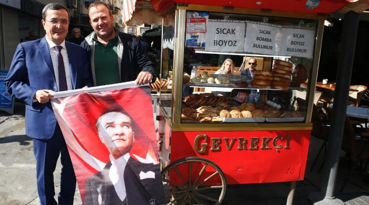 Konak Belediye Ba?kan? Abdül Batur, 96. y?l?n? kutlayaca??m?z Cumhuriyet Bayram? öncesinde Çankaya ve Alsancak’ta hizmet veren esnaf? ziyaret ederek Atatürk bask?l? poster hediye etti.