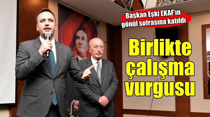 Toplant?da konu?an Bornova Belediye Ba?kan? Ömer E?ki, topluma hizmetin en temel gereklili?inin diyalog oldu?unu belirtti. Siyasi söylemleri bir kenara b?rakman?n önemine de?inen E?ki, "Hiçbir siyasi söylem olmadan, her renkten insan?n bir araya gelmesi ba?l? ba??na çok k?ymetli. Siyaset yapma amac?m?z, topluma hizmet etmektir ve bu hizmeti sunabilmek için diyalog kurmak zorunday?z. Yönetici olarak birbirimizle kavga etmeden, diplomasi kap?lar?n? aç?k tutarak toplumun sorunlar?na çözüm bulmal?y?z” dedi.