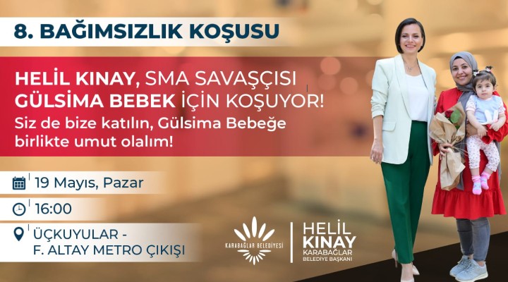 Ulu Önder Gazi Mustafa Kemal Atatürk'ün 105 y?l önce Samsun'a ayak basarak ulusal kurtulu? mücadelesini ba?latmas?n?n y?ldönümü, Karaba?lar Belediyesi taraf?ndan özel etkinliklerle kutlanacak. Bu kapsamda 8.'si düzenlenen “Ba??ms?zl?k Ko?usu”, 19 May?s Pazar günü saat 16.00'da Üçkuyular Fahrettin Altay Metro ç?k???ndan ba?layacak. Karaba?lar Belediye Ba?kan? Helil K?nay, Karaba?lar'da ya?ayan SMA Hastas? Gülsima bebe?in valilik onayl? kampanyas?na destek için ?nönü Caddesi güzergah?ndan 100. Y?l U?ur Mumcu Park?'na dek sürecek 4.5 kilometrelik ko?uya kat?lacak.