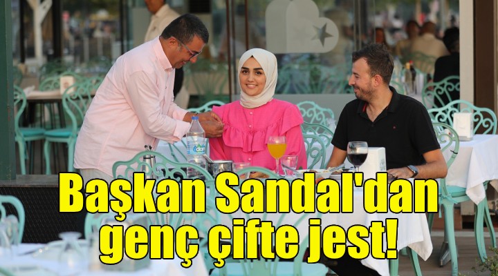 Bayrakl? Belediyesi An?t K?r Dü?ün alan?nda Haziran ay?nda dünya evine girdi?i gün olumsuz hava ko?ullar? nedeniyle e?lencesi yar?da kalan genç çifte Bayrakl? Belediye Ba?kan? Serdar Sandal, jest yapt?. A??r? ya?mur nedeniyle yar?da kesilen ve davetlilerin da??lmak zorunda kald??? dü?ün sonras? konudan haberdar olan Ba?kan Sandal, gelin ve damad? havuz restoranda a??rlad?, çeyrek alt?n hediye etti. Sandal, “Genç çiftin aile birli?inin ve mutluluklar?n?n daim olmas?n? diliyorum” dedi.