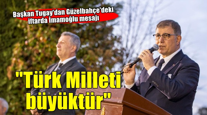 30 ilçede her ak?am yurtta?larla iftar soflar?nda bulu?tuklar?n? hat?rlatan Ba?kan Tugay, "Bugün de Güzelbahçe'ye misafir olduk. Sizlerle birlikte bu sofran?n etraf?nda oturmay? çok de?erli ve onurlu buluyorum. Herkesin aya??na, yüre?ine sa?l?k. Burada oldu?unuz, birlik ve beraberlik tablosunu olu?turdu?unuz için te?ekkür ediyorum. Ramazan?n?z hay?rl? olsun. Bu güzel ayda diledi?imiz bütün iyiliklerin, yapt???m?z ibadetlerin, tutulan oruçlar?n, dualar?n kabul olmas?n? diliyorum” ifadelerini kulland?.