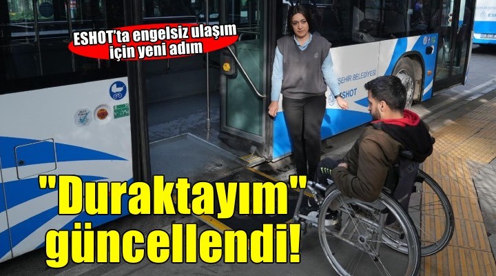 ESHOT Genel Müdürlü?ü taraf?ndan yürütülen çal??ma kapsam?nda, daha önce görme engelli yurtta?lar?n kullan?m?na sunulan teknolojik altyap?, fiziksel engelli kullan?c?lar?n ihtiyaçlar?na göre yeniden düzenlendi. IOS ve Android marketlerde ücretsiz olarak eri?ilebilen ESHOT Mobil uygulamas? üzerinden çal??an sistem aktif hale getirildi.