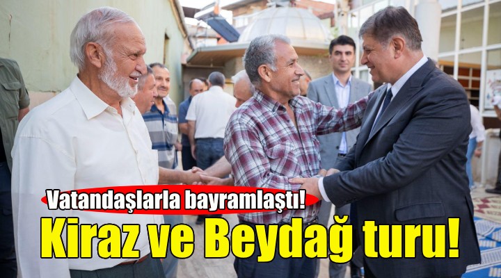 ?zmir Büyük?ehir Belediye Ba?kan? Dr. Cemil Tugay, Kurban Bayram?'n?n ilk günü Kiraz ve Beyda?'da yurtta?larla bir araya geldi. Ba?kan Tugay, sabah?n ilk saatlerinde Kiraz'a gitti. Kiraz Belediye Ba?kan? Nasuh Co?kun'un kar??lad??? Ba?kan Tugay'a ?ZBETON Genel Müdürü Hüseyin Sezer, ?ZSU Genel Müdürü Gürkan Erdo?an, ?ZTARIM Yönetim Kurulu Ba?kan? ve Tar?msal Hizmetler Daire Ba?kan? Ziya Çavdar ile bürokratlar da e?lik etti.