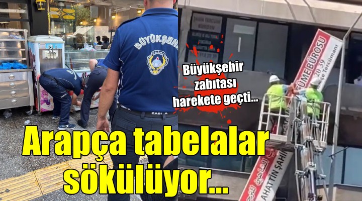 SONKALE?ZM?R- ?zmir Büyük?ehir Belediyesi zab?ta ekipleri, Konak'?n Basmane semtinde Suriyeliler'in yo?un oldu?u bölgelerde görülen Arapça tabelalar için harekete geçti. Ekipler, birçok noktada görülen ve talimatlara ayk?r? as?lan tabelalar? söktü. Dükkanlar?n önündeki yaz?lar ç?kar?l?rken, binalar?n üst bölümlerindeki Arapça tabelalar ise vinç yard?m?yla ç?kar?ld?.