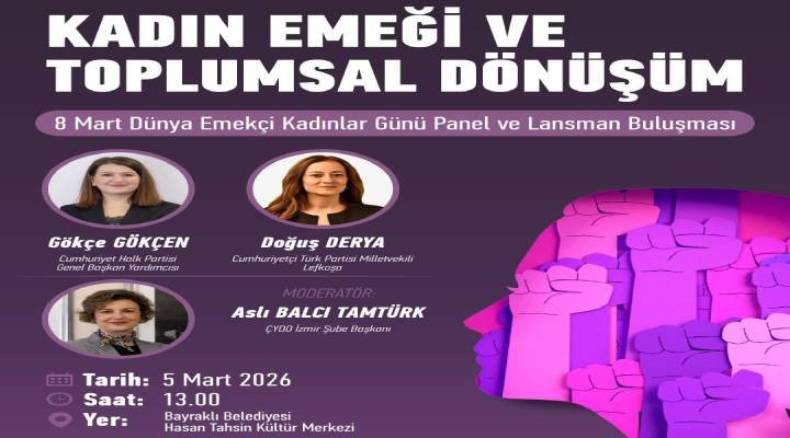 5 Mart 2026 Per?embe günü saat 13.00’te Hasan Tahsin Kültür Merkezi’nde gerçekle?tirilecek programda; kad?n eme?inin görünürlü?ü, yerel yönetimlerin e?itlik politikalar? ve toplumsal dönü?üm sürecinde kad?nlar?n rolü ele al?nacak. Panelde; Cumhuriyet Halk Partisi Genel Ba?kan Yard?mc?s? Gökçe Gökçen ve Cumhuriyetçi Türk Partisi Milletvekili Do?u? Derya konu?mac? olarak yer alacak. Program?n moderatörlü?ünü ise ÇYDD ?zmir ?ube Ba?kan? Asl? Balc? Tamtürk üstlenecek.