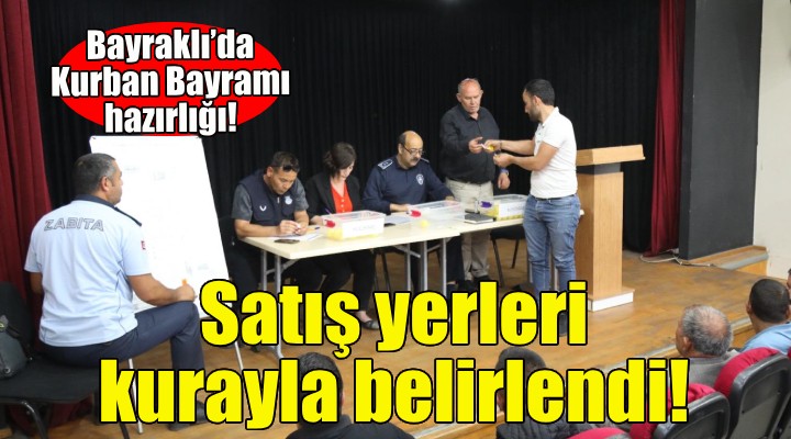 Türkiye’nin çe?itli illerinden kurban pazar? için gelen sat?c?lar?n vatanda?larla bulu?tu?u Bayrakl? Belediyesi kurban sat?? alan?ndaki yerler için Zab?ta Müdürlü?ü gözetiminde kura çekimi yap?ld?. Sat?c?lar, çad?r yerlerini kendi çektikleri kura ile belirledi. 84 çad?r yerinden 46 büyükba?, 32 küçükba? olmak üzere toplam 78 çad?r?n tahsisi yap?ld?. Bayram öncesi gerekli tüm önlemlerin al?naca?? hayvan sat?? alan?nda, sat?c?lar?n ve vatanda?lar?n ma?duriyet ya?amamas? için Bayrakl? Belediyesi Fen ??leri, Zab?ta, Veteriner, Temizlik ??leri Müdürlüklerinden nöbetçi ekiplerin de Kurban Bayram? süresince alanda görev yapaca?? belirtildi.
