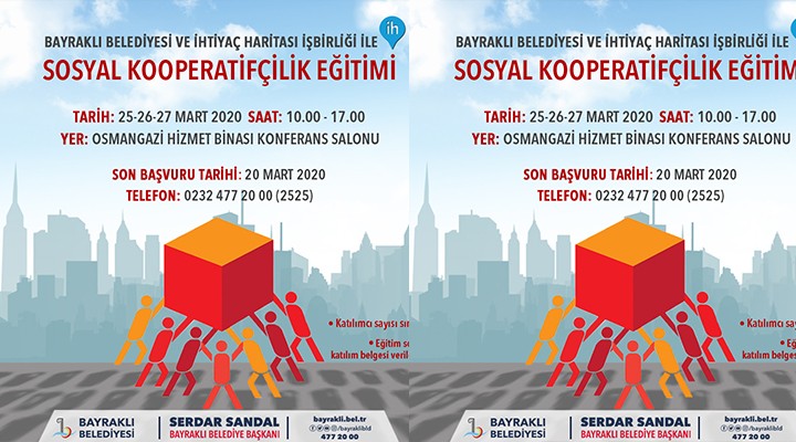 Bayrakl? Belediyesi, internet üzerinden yap?lan ba???larla ihtiyaç sahiplerine ula?ma imkan? sa?layan ?htiyaç Haritas? ile i? birli?i yaparak, e?itim semineri düzenliyor. 'Sosyal Kooperatifçilik' ba?l?kl? program kapsam?nda sosyal ve ekonomik örgütlenme, örneklerle vaka incelemesi, yeni nesil kooperatifçilik, ileti?im ve dijital pazarlama, dijital mecrada kooperatif görünürlü?ü, etkili dijital pazarlama teknikleri gibi e?itimler verilecek. Birlik olman?n ve dayan??man?n önemine dikkat çekilecek etkinlikte, kooperatiflerle gençlerin ve kad?nlar?n üretime kat?lmalar?n?n sa?lanmas? amaçlan?yor. E?itim seminerine kat?lmak isteyenlerin 20 Mart tarihine kadar Ar-Ge Müdürlü?ü'ne ba?vurabilece?i ücretsiz etkinlik sonunda kat?l?mc?lara sertifika verilecek.