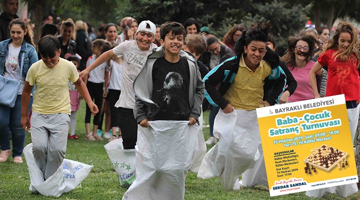 Bayrakl? Belediyesi babalar günü dolay?s?yla 15 Haziran Cumartesi günü baba çocuk satranç turnuvas?, 16 Haziran Pazar günü de baba çocuk futbol ?öleni ile babalar ve çocuklar?n? bir araya getirecek. 75. Y?l Kültür Merkezinde düzenlenecek satranç turnuvas? 09.00 - 18.00 saatleri aras?nda gerçekle?ecek. Son kay?t tarihi 13 Haziran olan baba çocuk satranç turnuvas? için Bayrakl? Belediyesi Kültür Müdürlü?ü, semt ve kültür merkezlerine ba?vuruda bulunulabiliyor.