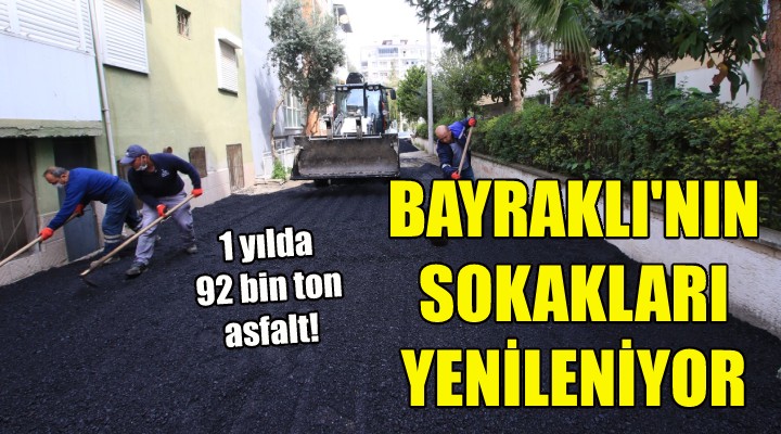 Ekipler, ilçenin ihtiyaç duyulan her mahallesinde asfalt yama, serim, kilit parke, bordür dö?eme i?lemleri yap?yor. Bu kapsamda ?zmir Büyük?ehir Belediyesiyle birlikte ortakla?a 24 mahallede yürütülen çal??malarda Bayrakl? sokaklar?na son 1 y?lda 59 bin 150 ton asfalt serimi, 32 bin 203 ton da yama i?lemi yap?ld?.