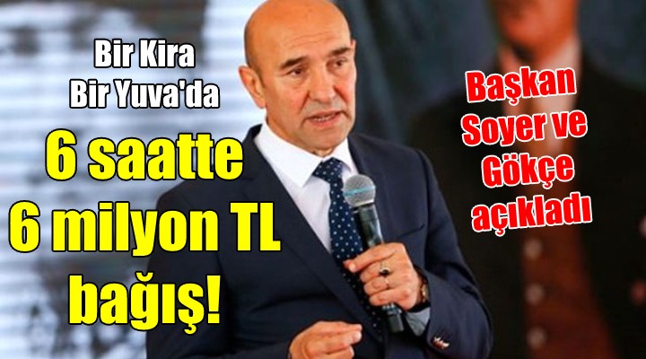 Soyer'den yakla??k 1 saat sonra ?zmir Büyük?ehir Belediyesi Genel Sekreteri Bu?ra Gökçe'den bir aç?klama geldi. Gökçe, kampanyada 6 saatin sonunda 6 milyon 355 bin TL yard?m miktar?na ula??ld???n? bildirdi. Bu?ra Gökçe, "http://birkirabiryuva.org üzerinden yuvas?n? kaybeden ailelerimize yuva oluyorsunuz. Deste?iniz öyle k?ymetli ki... 6 saat doldu?unda ula?t???m?z rakam gurur verici... Te?ekkürler Türkiye..." ifadelerine yer verirken ?u tabloyu payla?t?: