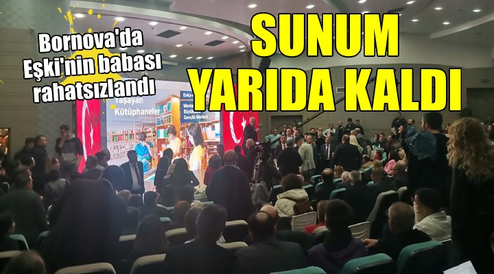 Ömer E?ki'nin sunumu devam ederken salonda bulunan babas? ?dris E?ki rahats?zland?. Baba E?ki'nin salondan ç?kar?ld?ktan sonra d??ar?da bayg?nl?k geçirdi?i aç?kland?. Salona gelen CHP Bornova ?lçe Ba?kan? Ertürk Çap?n, Ömer E?ki'nin babas?n?n ambulansla hastaneye kald?r?ld???n?, toplant?n?n iptal edildi?ini duyurdu.