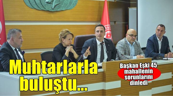 Bornova Belediye Ba?kan? Ömer E?ki, Nevzat Kavalar Kültür Merkezi Meclis Salonu’nda düzenlenen toplant?da Bornoval? muhtarlarla bir araya geldi. 45 mahallenin muhtar?n?n tek tek söz ald??? toplant?da, mahallelerde ya?anan sorunlar ve çözüm talepleri dile getirildi.