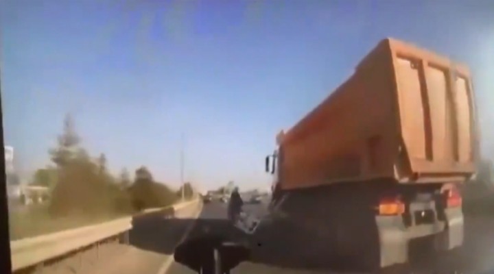 Ankara’da kimlikleri belirlenemeyen kamyon sürücüsü ile motosiklet sürücüsü, trafikte seyir halindeyken bilinmeyen bir nedenle tart??t?. ?ki sürücü birbirlerine el kol hareketi yaparak, tepkilerini gösterdi. Bu s?rada kamyon sürücü, sol taraf?nda bulunan motosikletin üzerine direksiyonu k?rd?.