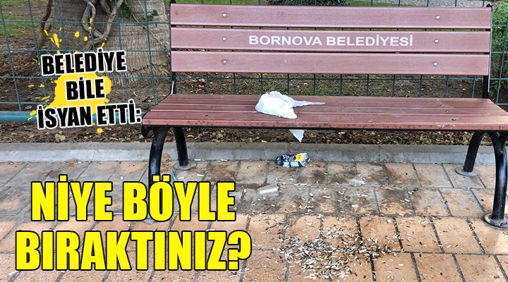 SONKALE?ZM?R-Bornova Belediyesi resmi twitter hesab?ndan Büyükpark'ta çekirdek kabuklar?n?n yere at?ld??? ve pislik içinde b?rak?lan bir bank?n foto?raf? payla??ld?. Payla??mda "Çevresini kirleten duyars?z vatanda?larla basit iki soru; Neden böyle b?rakt?n?z ? Temizleyen var diye mi?" ifadeleri yer ald?. Belediyenin bu payla??m?na çok say?da sosyal medya kullan?c?s? da destek vererek çevreyi kirleten ki?ilerin ceza almas?n? istedi.