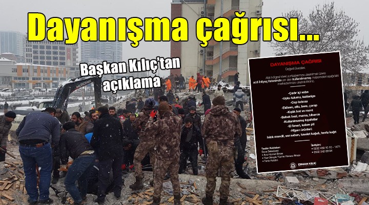 Sosyal medya hesab?ndan ça?r?da bulunan Buca Belediye Ba?kan? Erhan K?l?ç, tüm hem?ehrilerini kampanyaya destek olmaya davet etti. Ba?kan K?l?ç, “Kahramanmara? merkezli meydana gelen ve birçok ilimizi etkileyen deprem nedeniyle, ma?duriyet ya?ayan karde?lerimiz için yard?m kampanyas? ba?latt?k. Yaralar?m?z? birlikte sarmak için canla ba?la çal??aca??z” dedi.