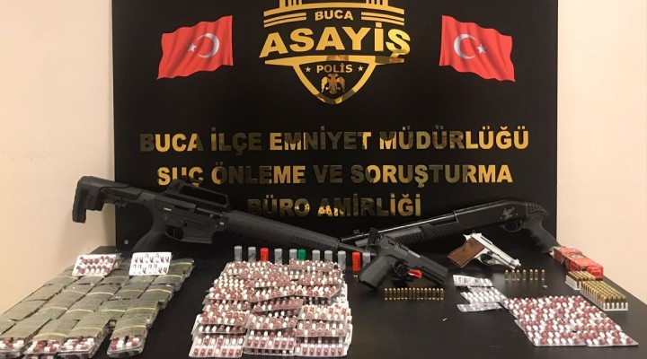 Buca ?lçe Emniyet Müdürlü?ü ekipleri, E.K. (22) VE B.K.'nin ilçede uyu?turucu madde sat??? yapt???n? tespit etti. Harekete geçen polis ekipleri, 2 ?üphelinin adreslerine operasyon düzenledi. Operasyonda yap?lan aramalarda ye?il reçeteye tabii 3 bin 28 adet uyu?turucu hap, 2 tabanca ve çok say?da mermi ele geçirildi.