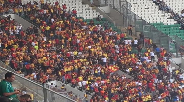 Göztepeli taraftarlar Bursaspor’a deplasman?nda tak?mlar?n? yaln?z b?rakmad?. ?zmir’den yola ç?kan yakla??k 2 bin 500 Göztepeli futbolsever kendilerine ayr?lan yeri doldurdu. 40 bin Bursasporlu taraftar da tak?mlar?na destek verirken, iki tak?m taraftar? aras?nda centilmenlik rüzgar? esti. Maçtan önce Bursa’da birlikte gezen Bursasporlu ve Göztepeliler stada da beraber geldi. Göztepeli taraftarlar?n girdi?i kap?daki turnikenin bozulmas? nedeniyle giri?lerin biletsiz gerçekle?tirildi?i ö?renildi.