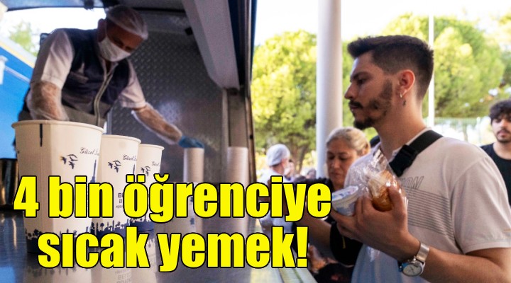 ?zmir Büyük?ehir Belediyesi’nin e?itimde f?rsat e?itli?i ilkesi do?rultusunda üniversite ö?rencilerine verdi?i s?cak yemek deste?i bu y?l da devam ediyor. Ege Üniversitesi, Katip Çelebi Üniversitesi, Bak?rçay Üniversitesi, Demokrasi Üniversitesi, 9 Eylül Üniversitesi ve ?zmir Yüksek Teknoloji Enstitüsü (?YTE) kampüslerinde ve yak?n?nda olu?turulan yemek da??t?m noktalar? sayesinde ö?renciler ücretsiz olarak günlük s?cak yemek ihtiyaçlar?n? kar??layabiliyor.