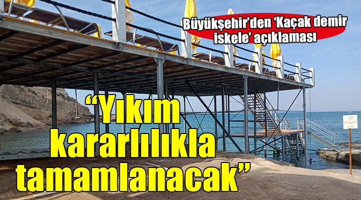 SONKALE?ZM?R-?zmir Büyük?ehir Belediyesi ekipleri, Ay?bal??? Koyu'ndaki kaçak demir iskelenin y?k?m? için gittikleri alanda i?letmeci firma taraf?ndan engellenmi?ti. Büyük?ehir Belediyesi, ya?ananlar?n ard?ndan yaz?l? bir aç?klama yapt?. Y?k?m için 'Kararl?l?k' vurgusu yap?lan aç?klama ?öyle: