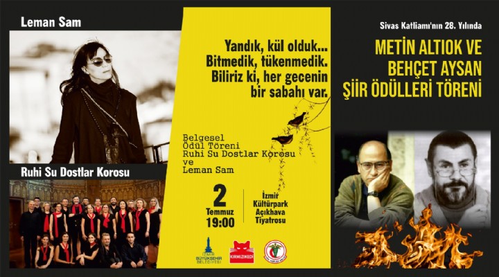 ?zmir Büyük?ehir Belediyesi, Türk Tabipler Birli?i ve K?rm?z? Kedi Yay?nlar? i?birli?iyle Sivas Katliam?’n?n 28. y?ldönümünde Mad?mak Oteli’nde katledilen ayd?nlar? 2 Temmuz Cuma günü anacak. Kültürpark Aç?khava Tiyatrosu’ndaki anma program? 20.00’de Meral Alt?ok Odaba?o?lu ve Tuncer Y??c?’n?n okuyaca?? ?iirlerle ba?layacak. Gecede ?air Metin Alt?ok ve Behçet Aysan’?n adlar?na düzenlenen ?iir yar??mas?n?n ödül töreni yap?lacak. Pandemi nedeniyle geçen y?l ödüllerini alamayan ?airler de bu y?l yap?lacak törende ödüllerini alacak. Metin Alt?ok ve Behçet Aysan’? anlatan “?ki Yol Arkada??” belgeselinin ilk gösteriminin ard?ndan Ruhi Su Dostlar Korosu ile Leman Sam konser verecek.