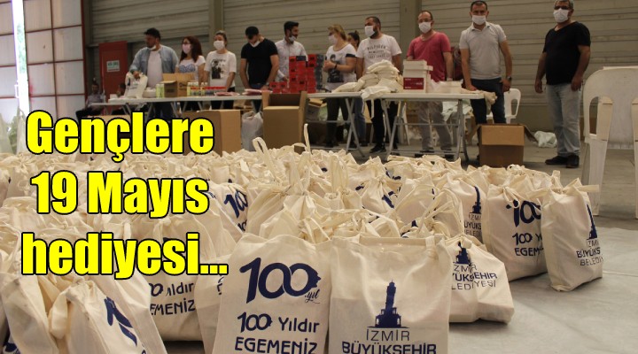 ?zmir Büyük?ehir Belediyesi gençlere 19 May?s hediyesi da??tmaya devam ediyor. ?çinde Nutuk, Türk bayra??, kulakl?k, kolonya, el dezenfektan? ve maske bulunan bez çantalardan 5 bin gence da??t?ld?.
